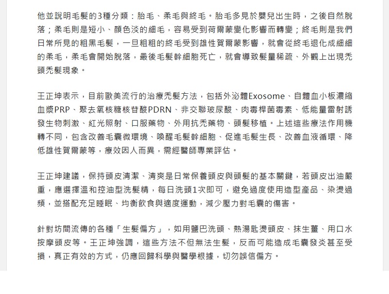 針對坊間流傳的各種「生髮偏方」,如用鹽巴洗頭、熱湯匙燙頭皮、抹生薑、用口水按摩頭皮等。王正坤強調,這些方法不但無法生髮,反而可能造成毛囊發炎甚至受損,真正有效的方式,仍應回歸科學與醫學根據,切勿誤信偏方。