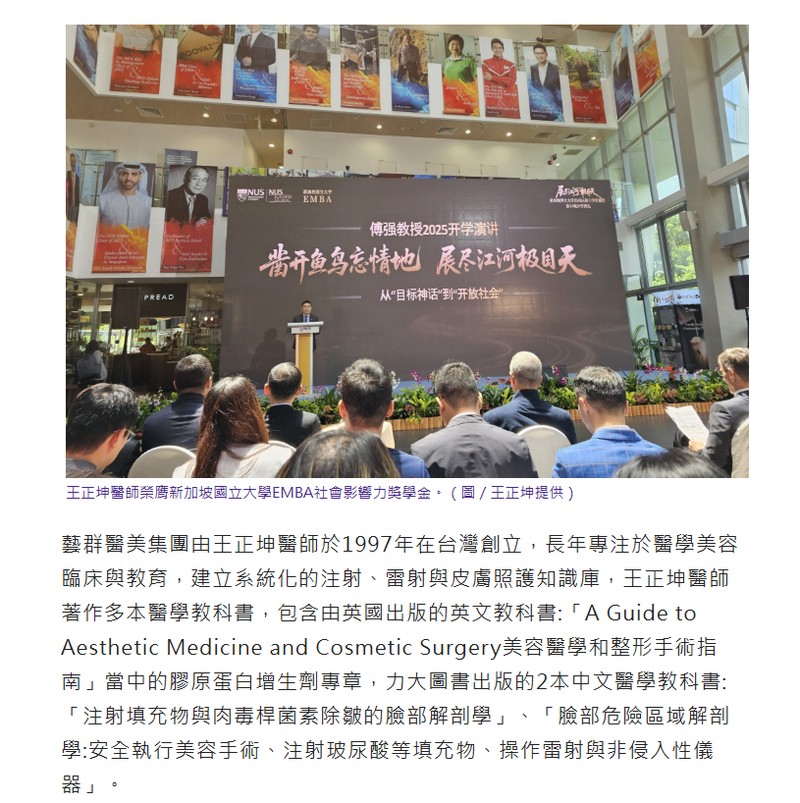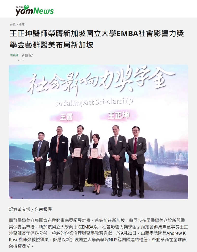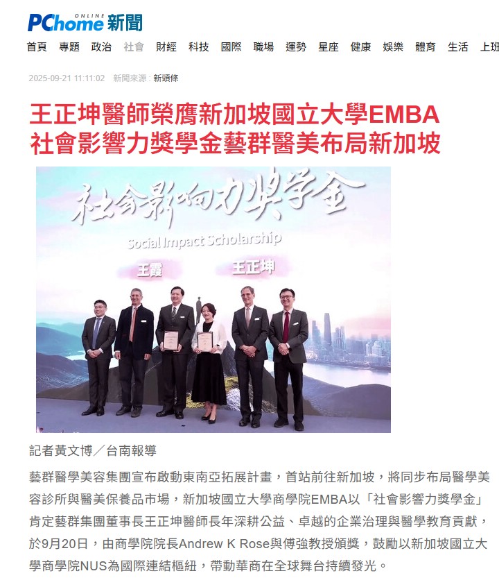 王正坤醫師榮膺新加坡國立大學EMBA社會影響力獎學金藝群醫美布局新加坡 -新頭條新聞-享新聞-睿傳媒-在地人新聞 LTVNews-coolbar Life生活誌-GOTHE 走.遊-屏東時報電子報-勢傳媒-奧丁丁新聞-yamNews新聞-PChome新聞