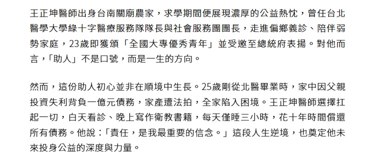 王正坤醫師出身台南關廟農家,求學期間便展現濃厚的公益熱忱,曾任台北醫學大學綠十字醫療服務隊隊長與社會服務團團長,走進偏鄉義診、陪伴弱勢家庭,23歲即獲頒「全國大專優秀青年」並受邀至總統府表揚。對他而言,「助人」不是口號,而是一生的方向。