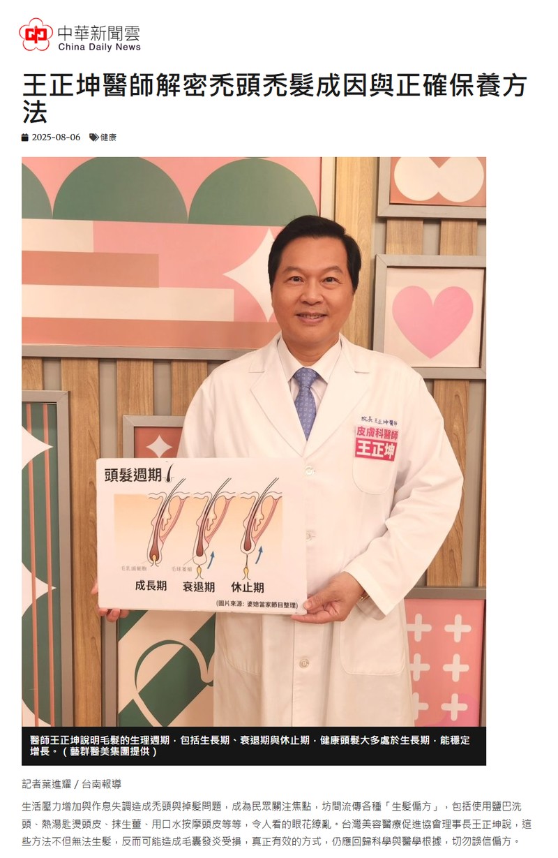 近年來,隨著生活壓力增加與作息失調,禿頭與掉髮問題成為民眾關注的焦點,王正坤醫師多次受邀上電視節目,針對禿髮議題進行深入淺出解說。他首先解釋毛髮的生理週期,包括生長期、衰退期與休止期,健康頭髮大多處於生長期,能穩定增長;若因荷爾蒙失調、壓力過大或營養不良導致生長期縮短、休止期延長,就會加速掉髮,進而產生禿頭問題。