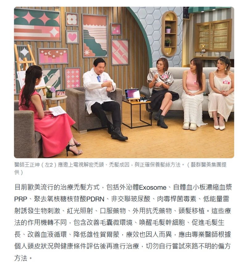 醫師王正坤(左2)應邀上電視解密禿頭、禿髮成因,與正確保養髮絲方法。(藝群醫美集團提供)