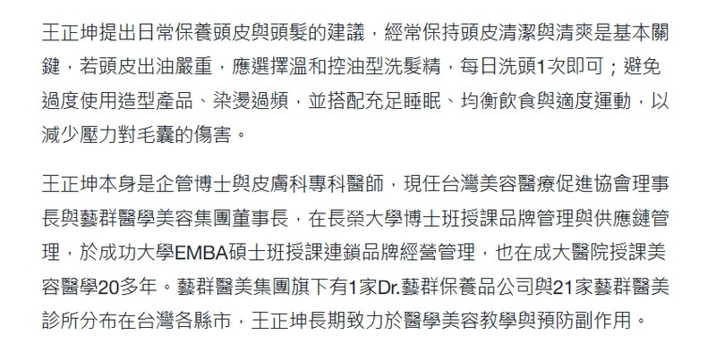 王正坤提出日常保養頭皮與頭髮的建議,經常保持頭皮清潔與清爽是基本關鍵,若頭皮出油嚴重,應選擇溫和控油型洗髮精,每日洗頭1次即可;避免過度使用造型產品、染燙過頻,並搭配充足睡眠、均衡飲食與適度運動,以減少壓力對毛囊的傷害。