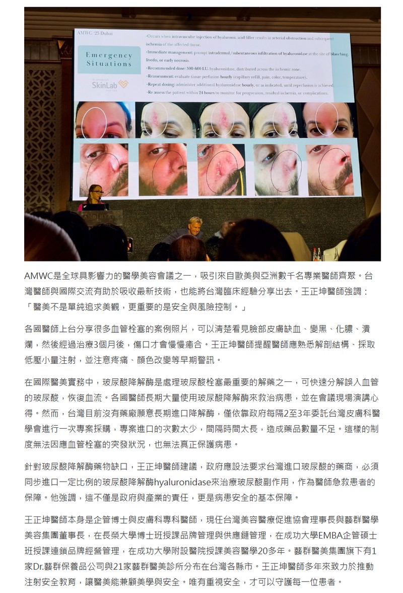 世界美容醫學大會AMWC於10月1日到3日在杜拜舉行,藝群醫學美容集團董事長王正坤醫師受邀出席。本屆的醫美副作用專題演講,各國醫師都聚焦在注射除皺安全與併發症防治。