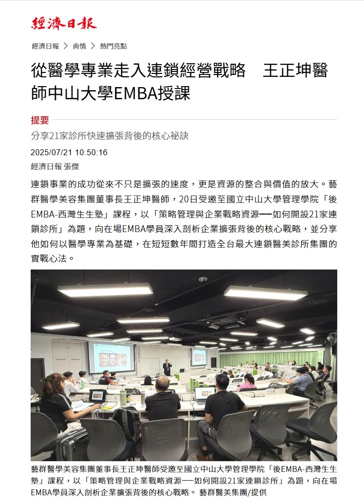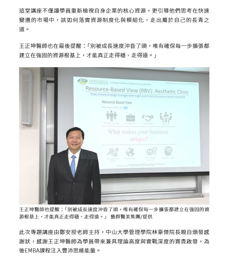 連鎖事業的成功從來不只是擴張的速度,更是資源的整合與價值的放大。藝群醫學美容集團董事長王正坤醫師,20日受邀至國立中山大學管理學院「後EMBA-西灣生生塾」課程,以「策略管理與企業戰略資源──如何開設21家連鎖診所」為題,向在場EMBA學員深入剖析企業擴張背後的核心戰略,並分享他如何以醫學專業為基礎,在短短數年間打造全台最大連鎖醫美診所集團的實戰心法。