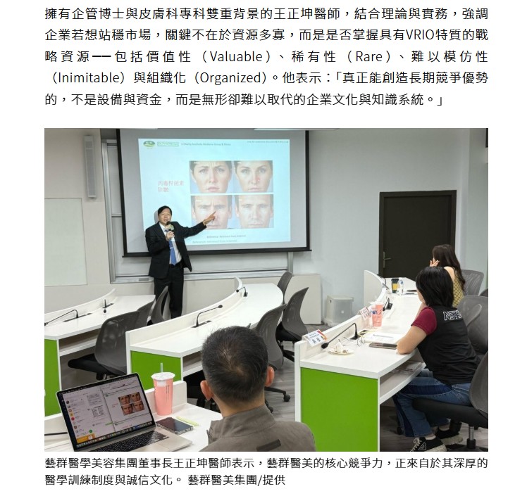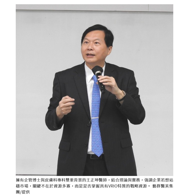 擁有企管博士與皮膚科專科雙重背景的王正坤醫師,結合理論與實務,強調企業若想站穩市場,關鍵不在於資源多寡,而是是否掌握具有VRIO特質的戰略資源──包括價值性(Valuable)、稀有性(Rare)、難以模仿性(Inimitable)與組織化(Organized)。他表示:「真正能創造長期競爭優勢的,不是設備與資金,而是無形卻難以取代的企業文化與知識系統。」