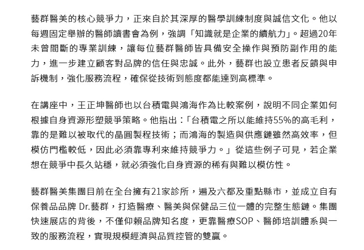 藝群醫美集團目前在全台擁有21家診所,遍及六都及重點縣市,並成立自有保養品品牌 Dr.藝群,打造醫療、醫美與保健品三位一體的完整生態鏈。集團快速展店的背後,不僅仰賴品牌知名度,更靠醫療SOP、醫師培訓體系與一致的服務流程,實現規模經濟與品質控管的雙贏。