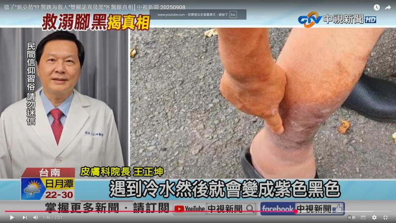 擋了"抓交替"!? 警跳海救人"雙腿詭異發黑"?! 醫曝真相│中視新聞 20250908 -藝群皮膚科診所院長王正坤醫師