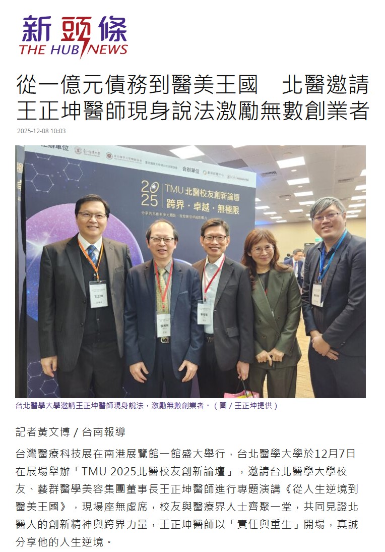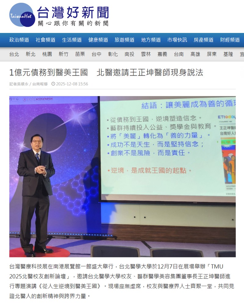 2025/12/09 1億元債務到醫美王國 北醫邀請王正坤醫師現身說法 -台灣好新聞 1億元債務到醫美王國 北醫邀請王正坤醫師現身說法 -台灣好新聞 https://www.taiwanhot.net/news/1121995/1億元債務到醫美王國+北醫邀請王正坤醫師現身說法 記者吳順永/台南報導 2025-12-08 15:56 台灣醫療科技展在南港展覽館一館盛大舉行,台北醫學大學於12月7日在展場舉辦「TMU ...