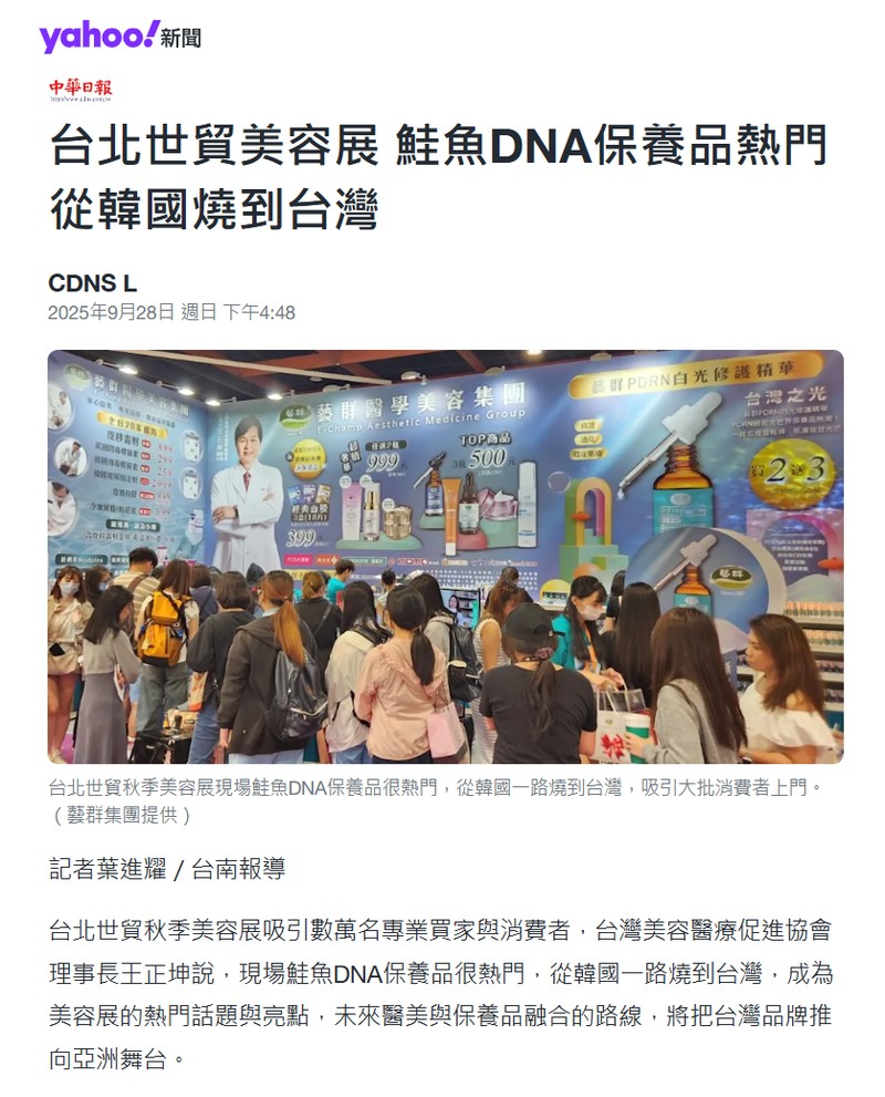 2025/09/29 標題: 鮭魚DNA保養品從韓國燒到台灣 2025台北世貿美容展 藝群PDRN白光修護領航亞洲保養-3 標題: 鮭魚DNA保養品從韓國燒到台灣 2025台北世貿美容展 藝群PDRN白光修護領航亞洲保養 2025台北世貿秋季美容展於9月26日至29日,在台北世貿一館舉行,匯聚來自台灣、日本、韓國等亞洲大廠品牌,聚焦當紅關鍵成分與技術,其中由藝群醫學美容集團董事長王正坤醫師主導的PDRN白光修護保養品...