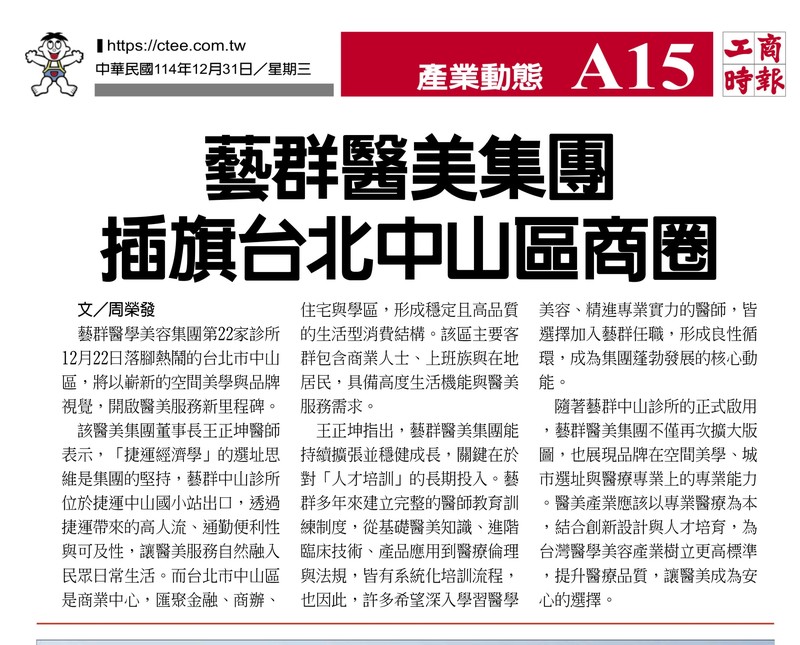 2025/12/22 標題: 藝群醫美集團第22家藝群中山診所開幕 插旗台北中山區商圈 深耕捷運經濟學與醫師人才培育 打造時尚醫美空間-6 標題: 藝群醫美集團第22家藝群中山診所開幕 插旗台北中山區商圈 深耕捷運經濟學與醫師人才培育 打造時尚醫美空間 藝群醫學美容集團第22家診所落腳熱鬧的台北市中山區,於12月22日,第22家分院「藝群中山診所」正式開幕,吸引眾多人潮排隊,蔚為奇觀。診所座落於台北市中山區民權東路,緊鄰...