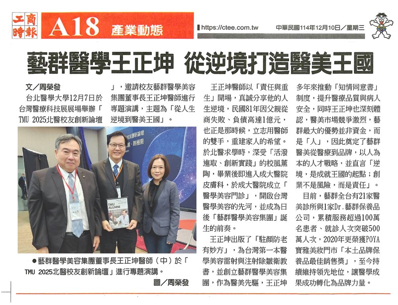 2025/12/08 標題: 從一億元債務到醫美王國 台北醫學大學邀請王正坤醫師現身說法 激勵無數創業者-1 標題: 從一億元債務到醫美王國 台北醫學大學邀請王正坤醫師現身說法 激勵無數創業者 台灣醫療科技展在南港展覽館一館盛大舉行,台北醫學大學於12月7日在展場舉辦「TMU 2025北醫校友創新論壇」,邀請台北醫學大學校友、藝群醫學美容集團董事長王正坤醫師進行專題演講《從人生逆境到醫美王...