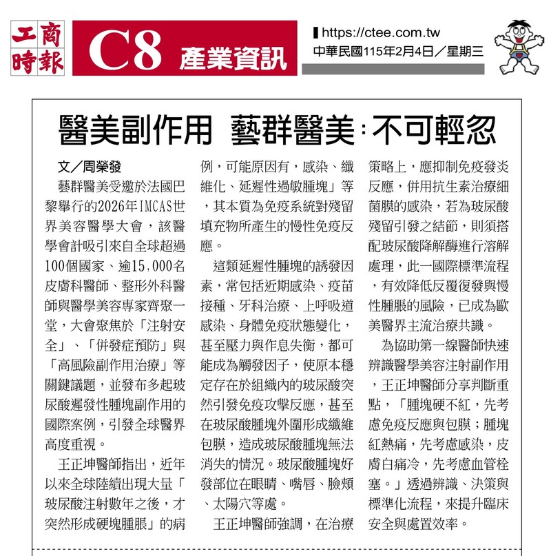 2026/01/30 標題: 法國巴黎IMCAS世界美容醫學大會發布多起玻尿酸遲發腫塊案例 藝群集團王正坤醫師示警 醫美副作用不可輕忽 -1 標題: 法國巴黎IMCAS世界美容醫學大會發布多起玻尿酸遲發腫塊案例 藝群集團王正坤醫師示警 醫美副作用不可輕忽 2026年IMCAS世界美容醫學大會於1月29日至31日,在法國巴黎盛大舉行,吸引來自全球超過 100個國家、逾 1 萬 5 千名皮膚科醫師、整形外科醫師與醫學美容專家齊聚一堂。大會聚焦...