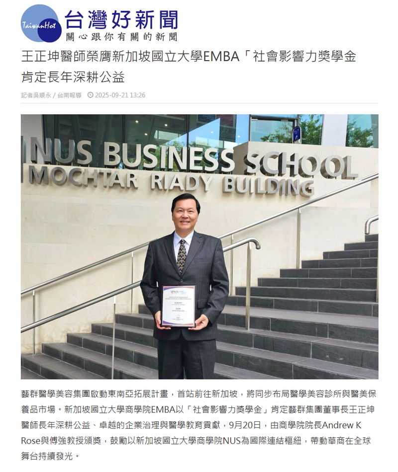 2025/09/23 王正坤醫師榮膺新加坡國立大學EMBA「社會影響力獎學金 肯定長年深耕公益 -台灣好新聞 王正坤醫師榮膺新加坡國立大學EMBA「社會影響力獎學金 肯定長年深耕公益 -台灣好新聞 https://www.taiwanhot.net/news/focus/1114749/王正坤醫師榮膺新加坡國立大學EMBA「社會影響力獎學金+肯定長年深耕公益/57/台南 記者吳順永/台南報導 2025-09-21 13:26 藝群醫學美容集團啟動...