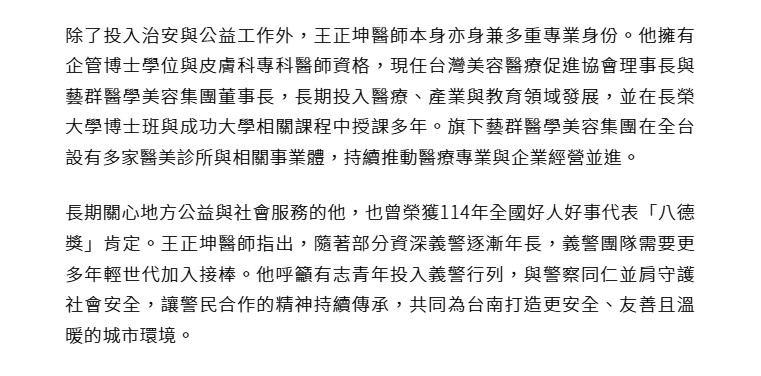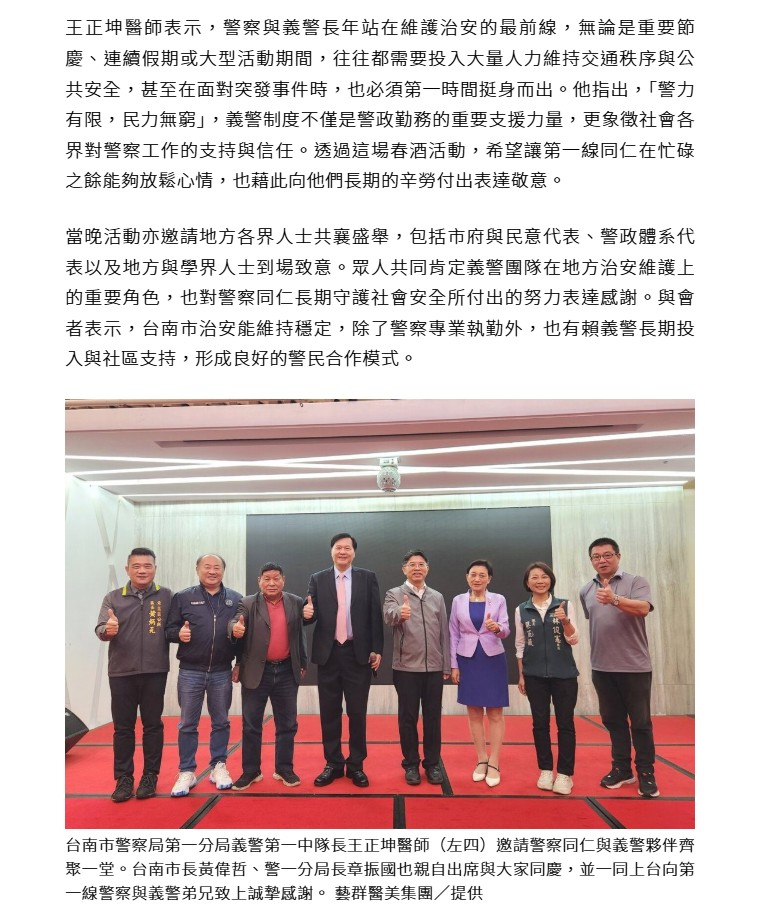 長期關心地方公益與社會服務的他,也曾榮獲114年全國好人好事代表「八德獎」肯定。王正坤醫師指出,隨著部分資深義警逐漸年長,義警團隊需要更多年輕世代加入接棒。他呼籲有志青年投入義警行列,與警察同仁並肩守護社會安全,讓警民合作的精神持續傳承,共同為台南打造更安全、友善且溫暖的城市環境。