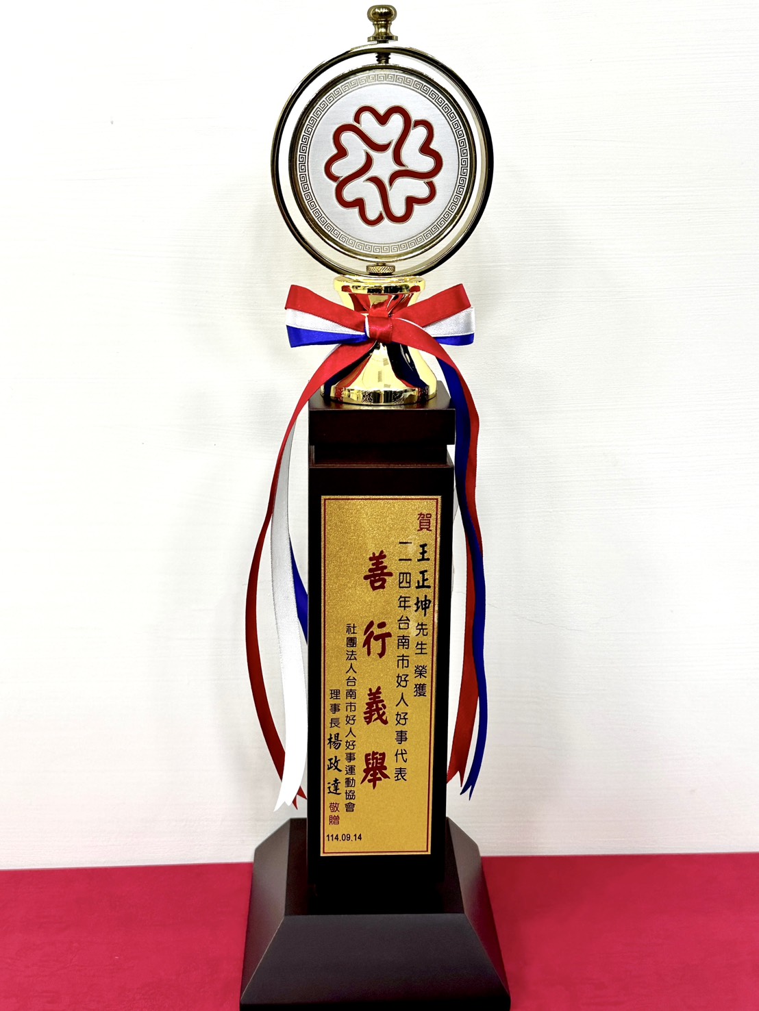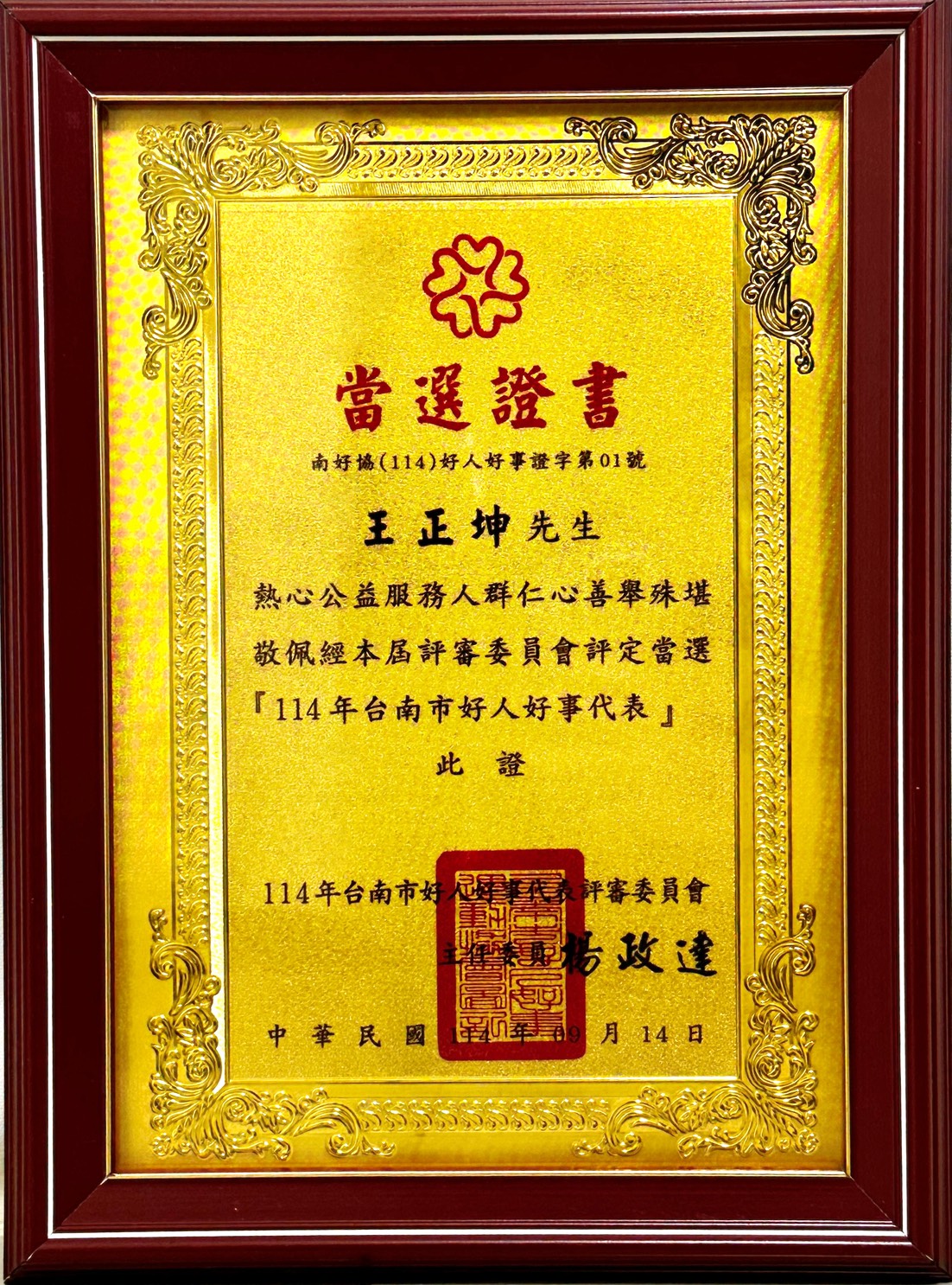 王政坤醫師 當選114台南好人好事代表-南好協(114)好人好事證字第01號