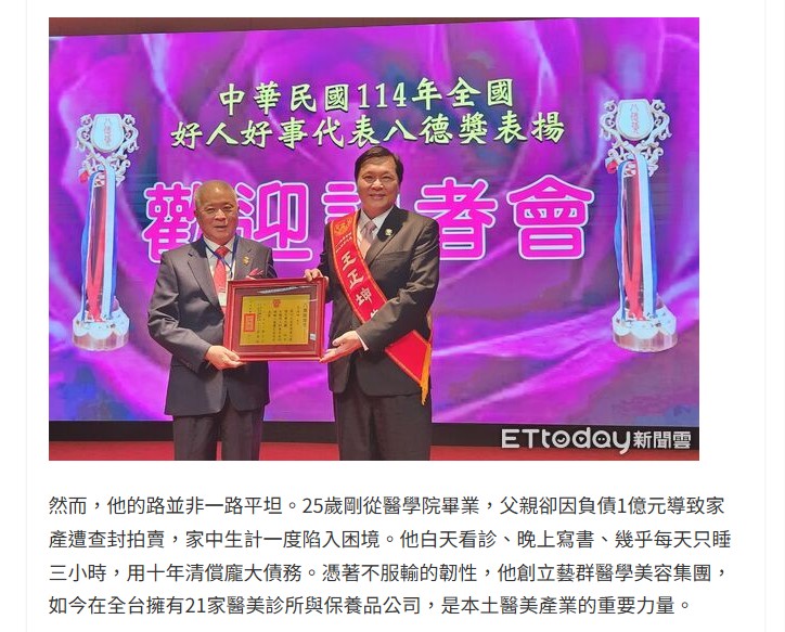 由中華民國表揚好人好事運動協會主辦的「2025年全國好人好事代表八德獎頒獎典禮」,10日於台北市政府青年局舉行,藝群醫學美容集團董事長王正坤醫師,以長年深耕醫療公益、扶弱濟貧、回饋教育的踏實行動,榮獲八德獎肯定,在醫界與企業界皆立下典範。
