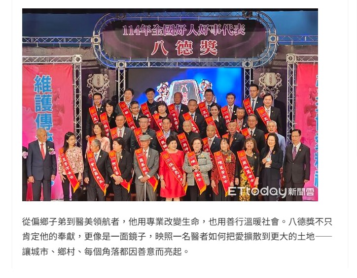 從偏鄉子弟到醫美領航者,他用專業改變生命,也用善行溫暖社會。八德獎不只肯定他的奉獻,更像是一面鏡子,映照一名醫者如何把愛擴散到更大的土地——讓城市、鄉村、每個角落都因善意而亮起。