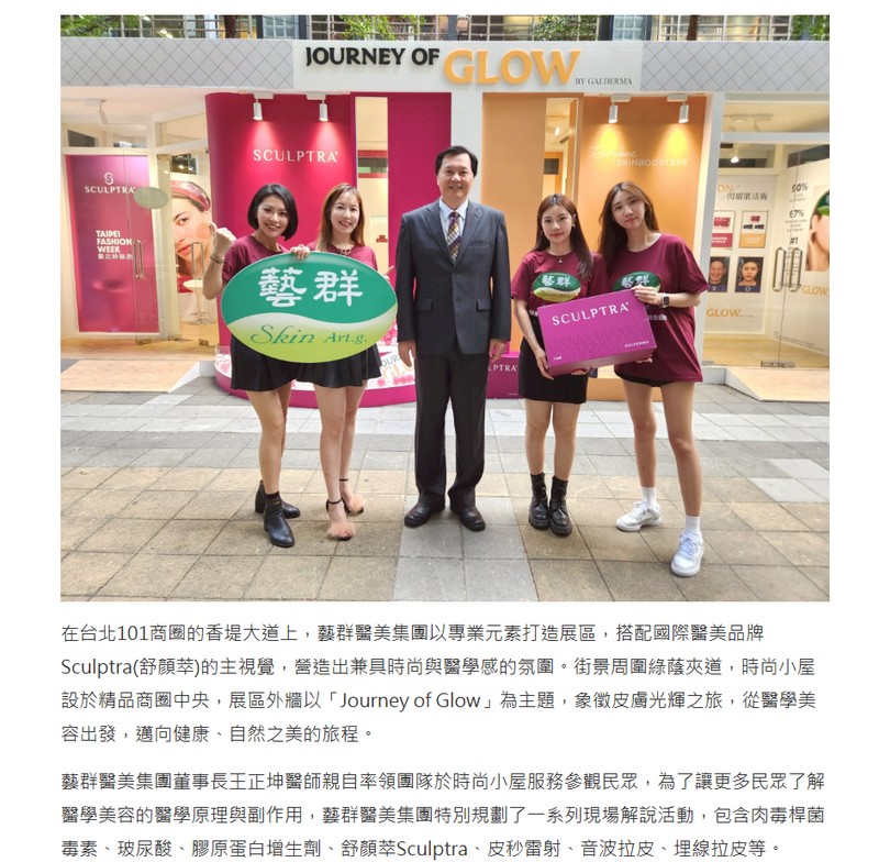 在台北101商圈的香堤大道上,藝群醫美集團以專業元素打造展區,搭配國際醫美品牌Sculptra(舒顏萃)的主視覺,營造出兼具時尚與醫學感的氛圍。街景周圍綠蔭夾道,時尚小屋設於精品商圈中央,展區外牆以「Journey of Glow」為主題,象徵皮膚光輝之旅,從醫學美容出發,邁向健康、自然之美的旅程。