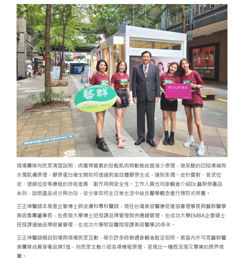 現場團隊向民眾清楚說明,肉毒桿菌素的放鬆肌肉與動態紋路減少原理,玻尿酸的凹陷填補與水潤肌膚原理,膠原蛋白增生劑如何透過刺激自體膠原生成,達到澎潤。皮秒雷射、音波拉皮、埋線拉皮等療程的技術差異、副作用與安全性。工作人員也向參觀者介紹Dr.藝群保養品系列,說明產品成分與功效,並分享如何在日常生活中結合醫學觀念進行預防式保養。