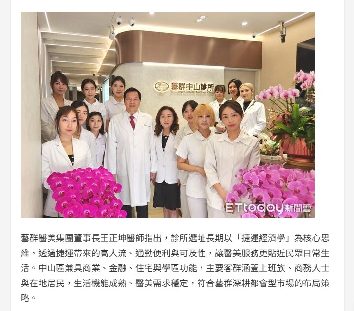藝群醫美集團董事長王正坤醫師指出,診所選址長期以「捷運經濟學」為核心思維,透過捷運帶來的高人流、通勤便利與可及性,讓醫美服務更貼近民眾日常生活。中山區兼具商業、金融、住宅與學區功能,主要客群涵蓋上班族、商務人士與在地居民,生活機能成熟、醫美需求穩定,符合藝群深耕都會型市場的布局策略。