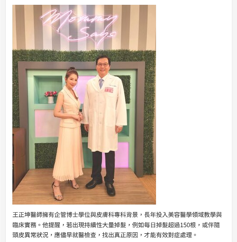 王正坤醫師擁有企管博士學位與皮膚科專科背景,長年投入美容醫學領域教學與臨床實務。他提醒,若出現持續性大量掉髮,例如每日掉髮超過150根,或伴隨頭皮異常狀況,應儘早就醫檢查,找出真正原因,才能有效對症處理。