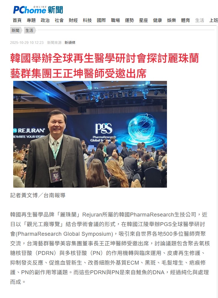韓國再生醫學品牌「麗珠蘭」Rejuran所屬的韓國PharmaResearch生技公司,近日以「觀光工廠導覽」結合學術會議的形式,在韓國江陵舉辦PGS全球醫學研討會(PharmaResearch Global Symposium),吸引來自世界各地500多位醫師齊聚交流,台灣藝群醫學美容集團董事長王正坤醫師受邀出席,討論議題包含聚去氧核糖核苷酸(PDRN)與多核苷酸(PN)的作用機轉與臨床運用、皮膚再生修護、抑制發炎反應、促進血管新生、改善細胞外基質ECM、黑斑、毛髮增生、疤痕修護、PN的副作用等議題。而這些PDRN與PN是來自鮭魚的DNA,經過純化與處理而成。