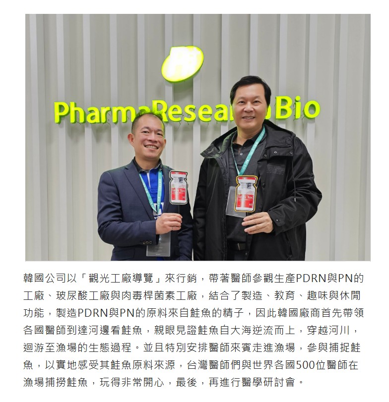 韓國公司以「觀光工廠導覽」來行銷,帶著醫師參觀生產PDRN與PN的工廠、玻尿酸工廠與肉毒桿菌素工廠,結合了製造、教育、趣味與休閒功能,製造PDRN與PN的原料來自鮭魚的精子,因此韓國廠商首先帶領各國醫師到達河邊看鮭魚,親眼見證鮭魚自大海逆流而上,穿越河川,迴游至漁場的生態過程。並且特別安排醫師來賓走進漁場,參與捕捉鮭魚,以實地感受其鮭魚原料來源,台灣醫師們與世界各國500位醫師在漁場捕撈鮭魚,玩得非常開心,最後,再進行醫學研討會。