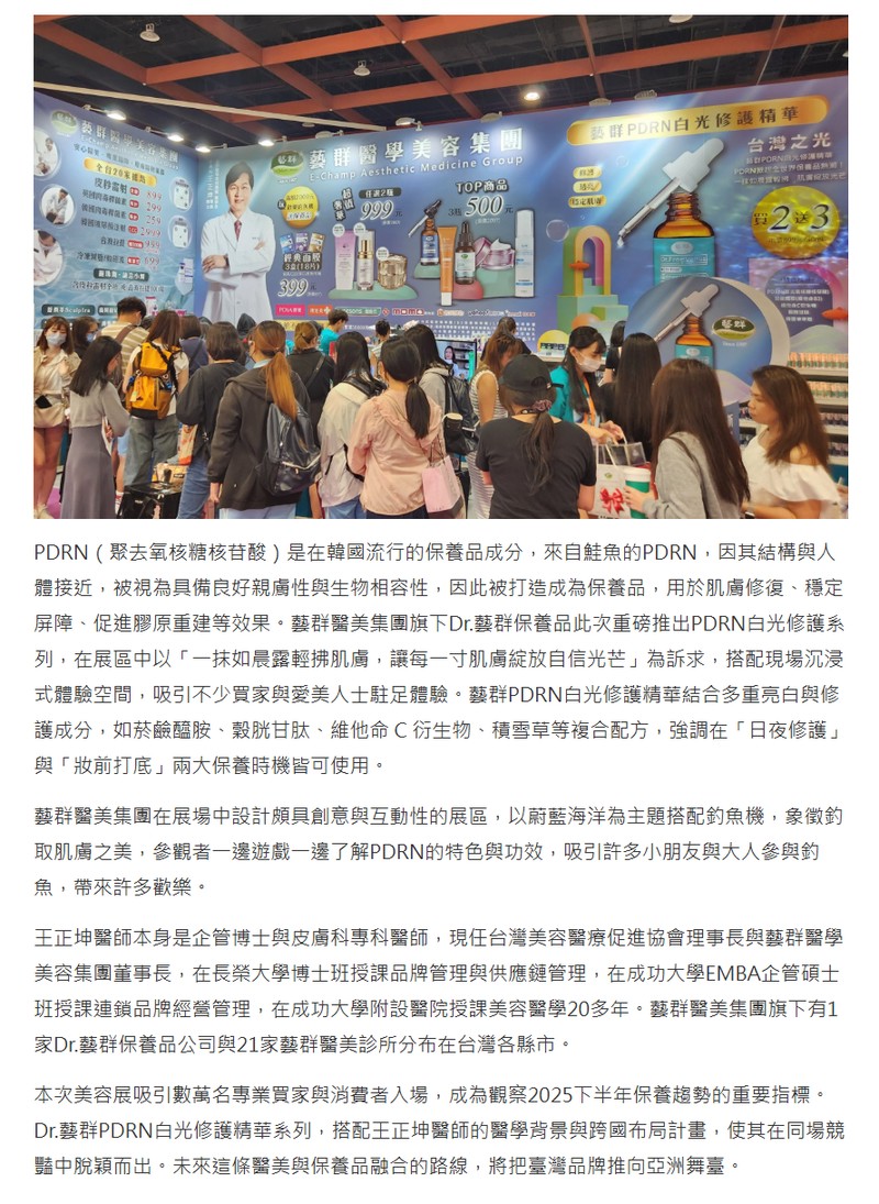 本次美容展吸引數萬名專業買家與消費者入場,成為觀察2025下半年保養趨勢的重要指標。Dr.藝群PDRN白光修護精華系列,搭配王正坤醫師的醫學背景與跨國布局計畫,使其在同場競豔中脫穎而出。未來這條醫美與保養品融合的路線,將把臺灣品牌推向亞洲舞臺。