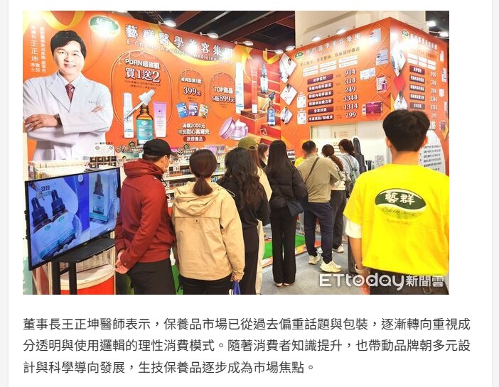 國際美容展登場 台南藝群醫美布局新加坡拚國際能見度 -東森新聞雲-ETtoday新聞雲 2026台北國際美容展登場,藝群醫美集團展示PDRN保養品。