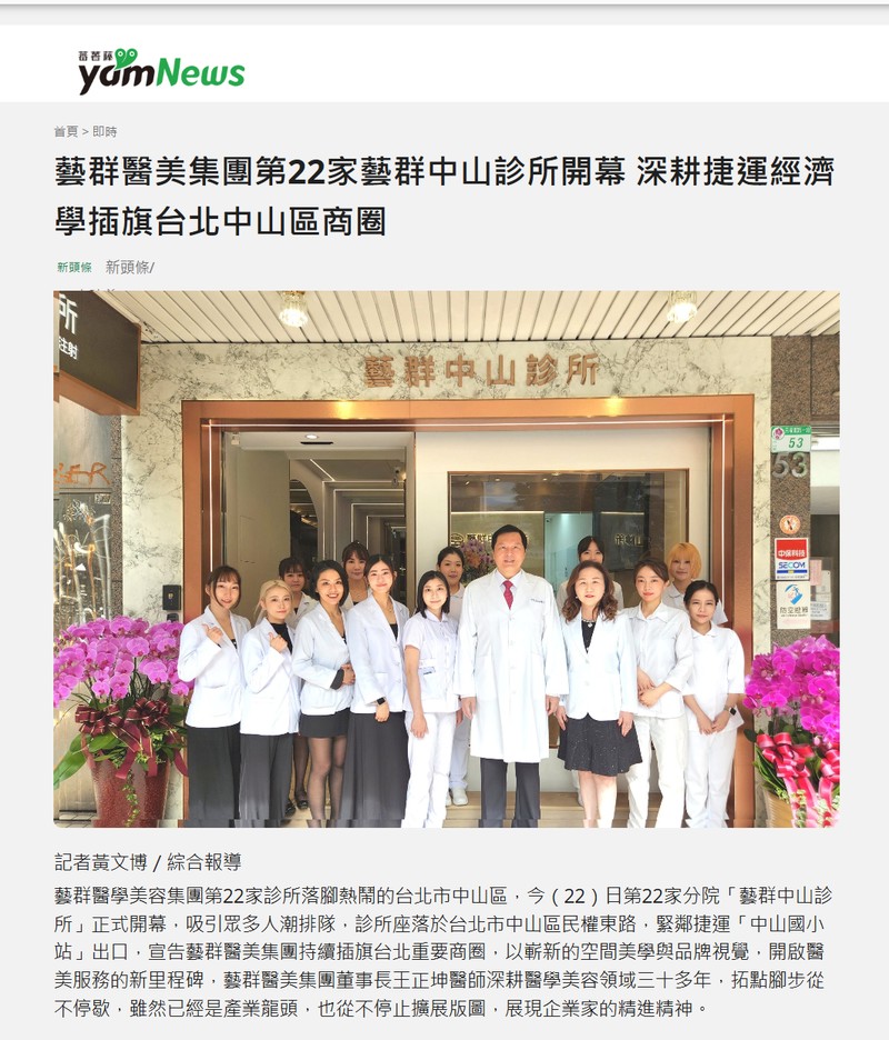 藝群醫美集團第22家藝群中山診所開幕 深耕捷運經濟學插旗台北中山區商圈 -新頭條新聞-享新聞-睿傳媒-奧丁丁新聞-在地人新聞LTVNews-coolbar Life生活誌-GOTHE 走.遊-屏東時報電子報-勢傳媒-台南時報-yam新聞 蕃薯藤新聞-PChome 新聞