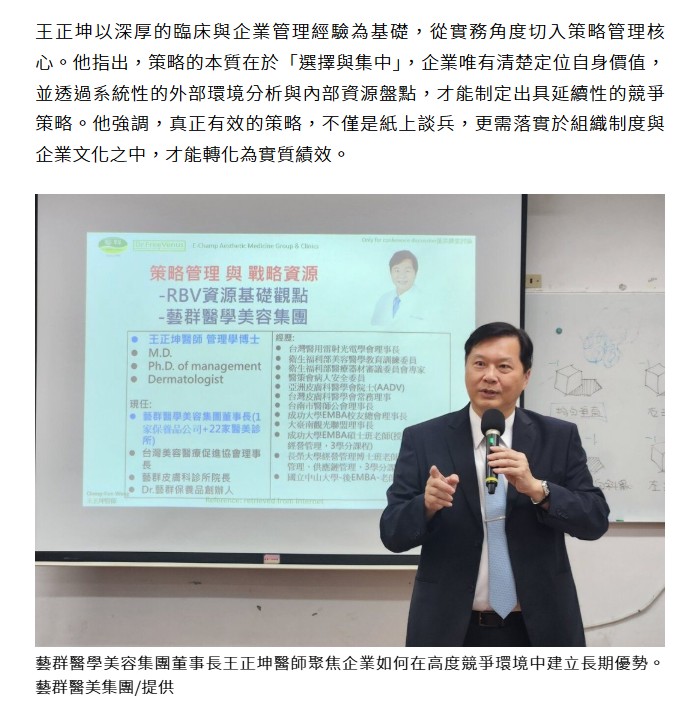 成功大學高階管理顧問班1日晚間舉辦專題課程,邀請藝群醫學美容集團董事長王正坤醫師擔任講座,於成功大學工業設計學系授課「管理策略與實務-以醫學美容產業為例」。課程聚焦企業如何在高度競爭環境中建立長期優勢,吸引多位企業高階主管與專業經理人到場參與,現場討論熱絡、互動踴躍。