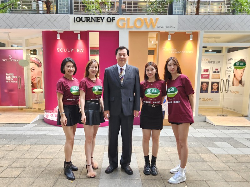 在台北101商圈的香堤大道上,藝群醫美集團以專業元素打造展區,搭配國際醫美品牌Sculptra(舒顏萃)的主視覺,營造出兼具時尚與醫學感的氛圍。街景周圍綠蔭夾道,時尚小屋設於精品商圈中央,展區外牆以「Journey of Glow」為主題,象徵皮膚光輝之旅,從醫學美容出發,邁向健康、自然之美的旅程。