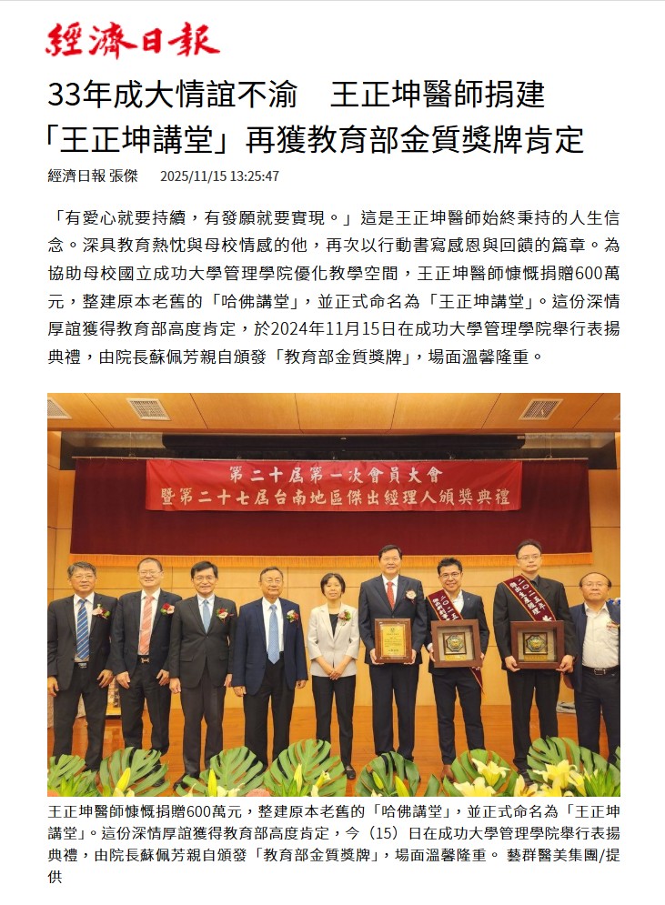 2025/11/15 標題: 三十三年成大緣 王正坤醫師捐600萬元建「王正坤講堂」回饋成功大學 再獲教育部金質獎牌表揚-1 標題: 三十三年成大緣 王正坤醫師捐600萬元建「王正坤講堂」回饋成功大學 再獲教育部金質獎牌表揚 有愛心就要持續,有發願就要實現。長期投入教育公益並深具母校情感的王正坤醫師,捐款 600 萬元協助母校成功大學管理學院進行講堂整建,並命名為「王正坤講堂」。教育部肯定其善行義舉與對...