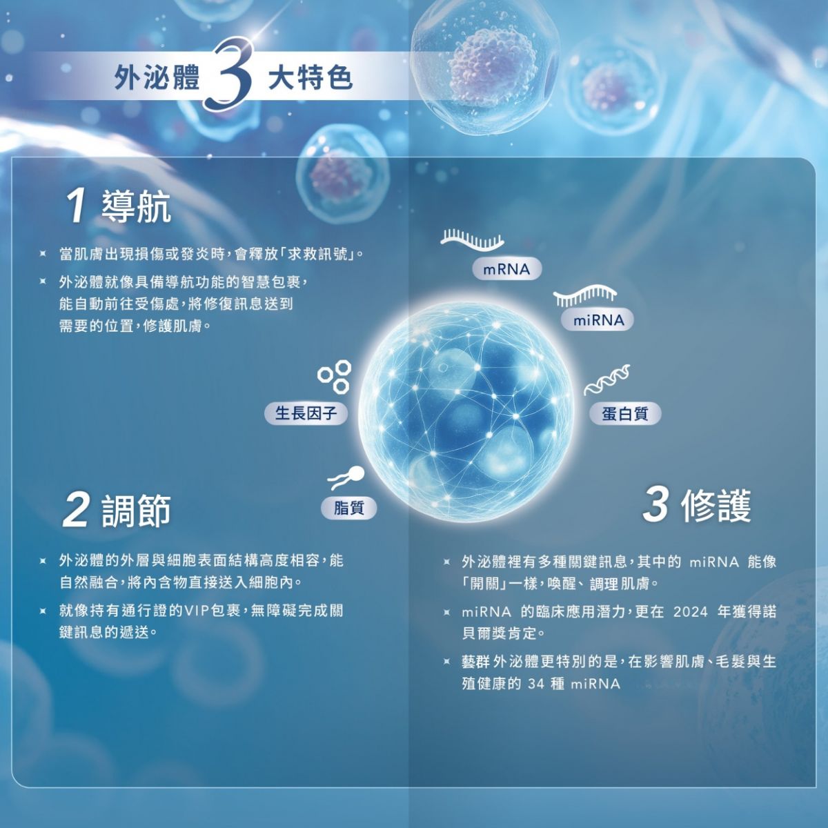 外泌體則是這些幹細胞釋放出的「載體」,內含多種 生長因子(Cytokines )、蛋白質、RNA 等訊息分子,能將幹細胞的「修護指令」傳遞給其他細胞。