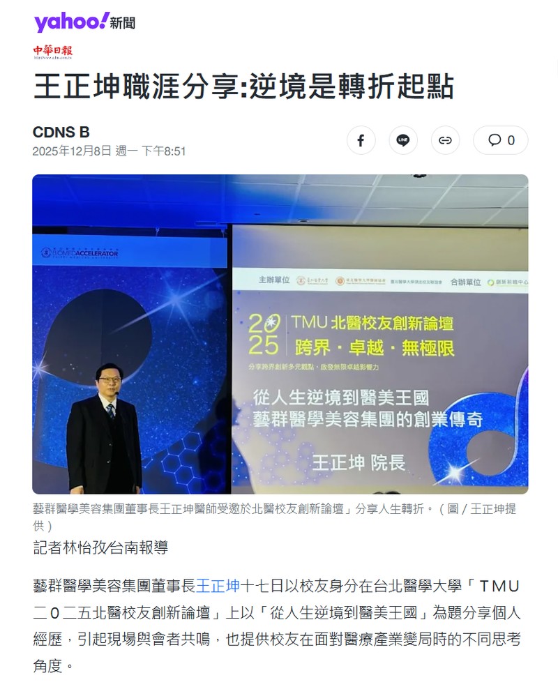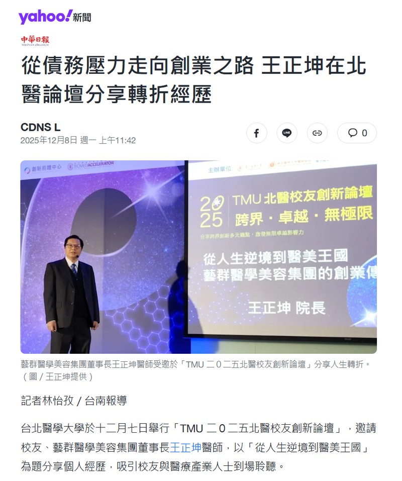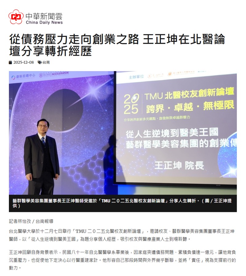 藝群醫學美容集團董事長王正坤十七日以校友身分在台北醫學大學「TMU二0二五北醫校友創新論壇」上以「從人生逆境到醫美王國」為題分享個人經歷,引起現場與會者共鳴,也提供校友在面對醫療產業變局時的不同思考角度。