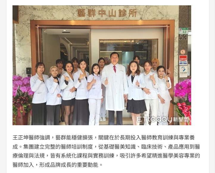 王正坤醫師強調,藝群能穩健擴張,關鍵在於長期投入醫師教育訓練與專業養成。集團建立完整的醫師培訓制度,從基礎醫美知識、臨床技術、產品應用到醫療倫理與法規,皆有系統化課程與實務訓練,吸引許多希望精進醫學美容專業的醫師加入,形成品牌成長的重要動能。