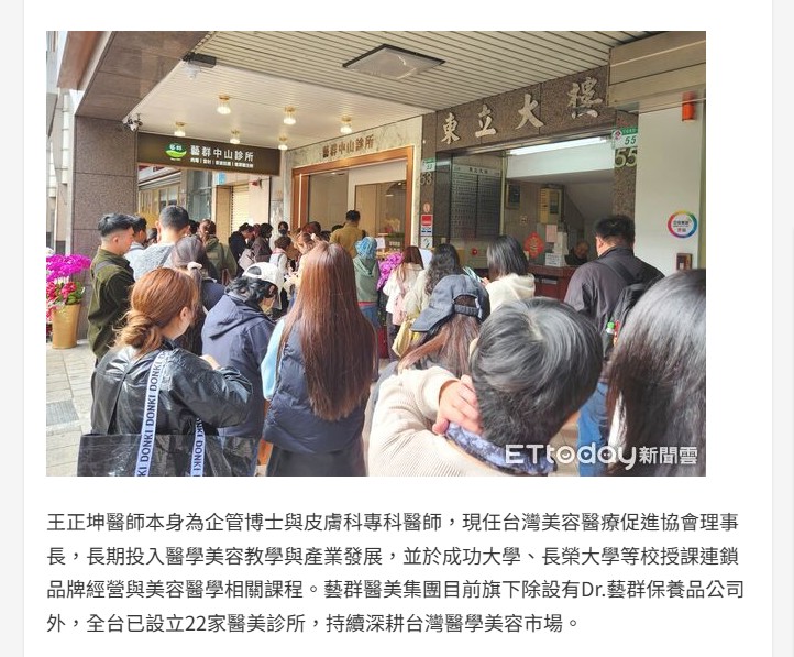 王正坤醫師本身為企管博士與皮膚科專科醫師,現任台灣美容醫療促進協會理事長,長期投入醫學美容教學與產業發展,並於成功大學、長榮大學等校授課連鎖品牌經營與美容醫學相關課程。藝群醫美集團目前旗下除設有Dr.藝群保養品公司外,全台已設立22家醫美診所,持續深耕台灣醫學美容市場。