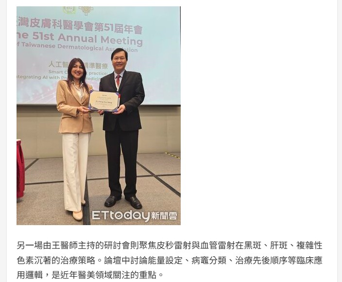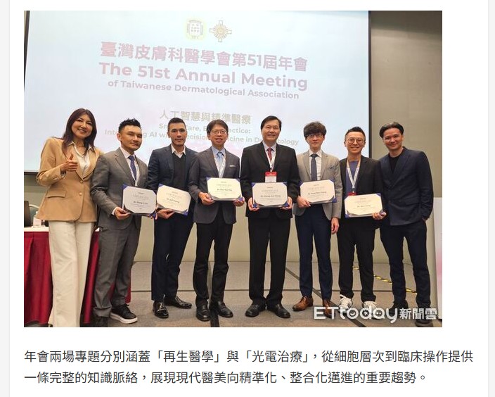 台灣皮膚科醫學會第51屆年會於11月8日至9日在台北國際會議中心舉行,今年焦點之一是由藝群醫學美容集團董事長王正坤醫師主持的兩場專題論壇,分別談論「非交聯玻尿酸生物重塑」與「皮秒雷射搭配血管雷射治療黑斑與肝斑策略」,完整呈現再生醫學與臨床光電整合的最新發展。