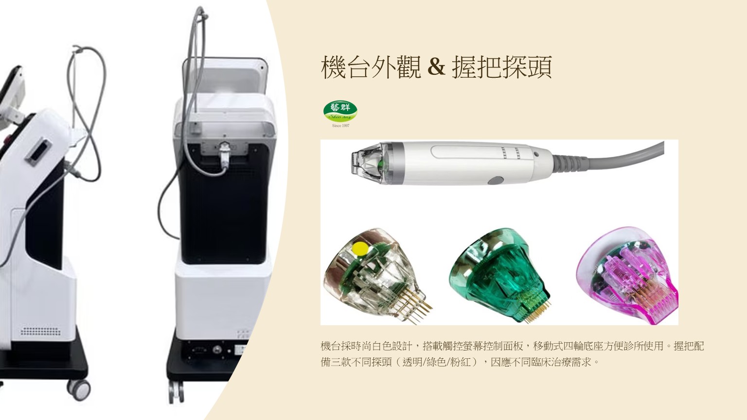 多種探頭選擇,且醫師可根據治療目標調整針尖刺入深度,透過操作介面設定,針的深度可在皮膚表面下 0.5 至 4.0 毫米之間精準調整。