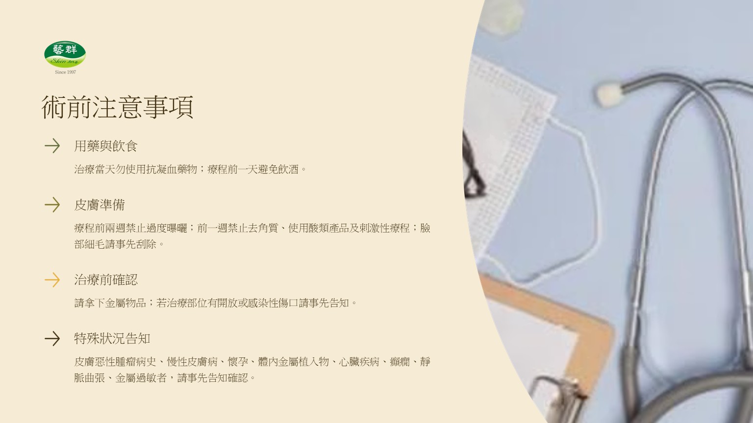 ▲特殊狀況告知:皮膚惡性腫瘤病史、慢性皮膚病、懷孕、體內金屬植入物、心臟疾病、癲癇、靜脈曲張、金屬過敏者,請事先告知確認。