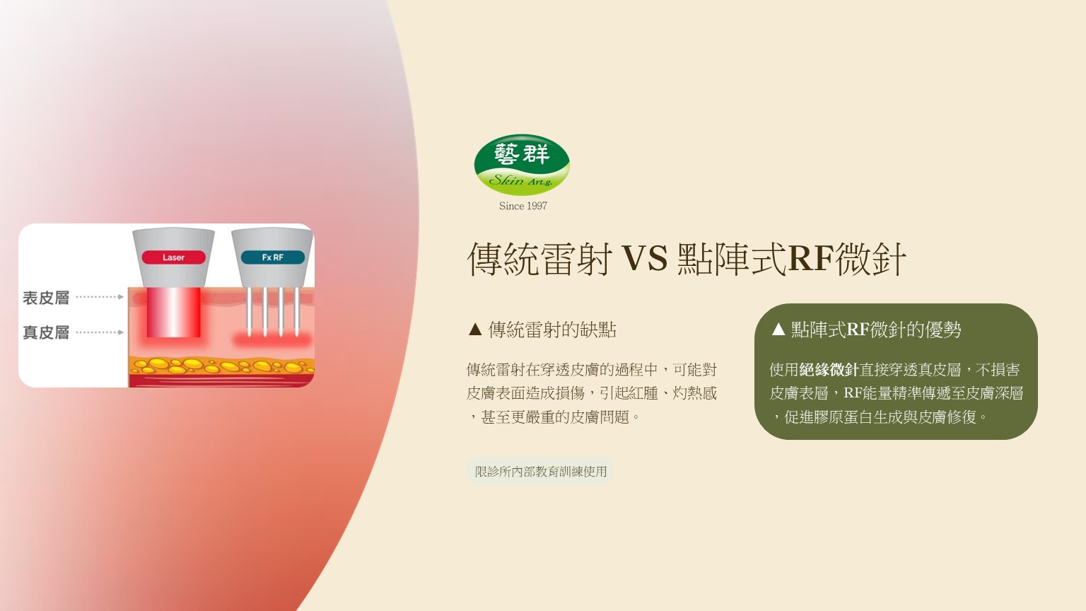 ▲ 傳統雷射的缺點:傳統雷射在穿透皮膚的過程中,可能對皮膚表面造成損傷,引起紅腫、灼熱感,甚至更嚴重的皮膚問題。