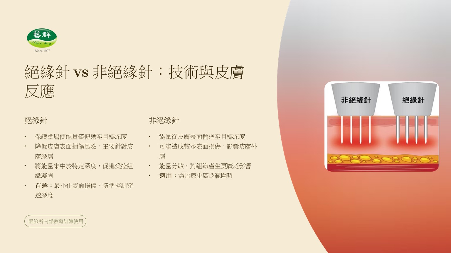 ▲絕緣針:保護塗層使能量僅傳遞至目標深度、降低皮膚表面損傷風險,主要針對皮膚深層、將能量集中於特定深度,促進受控組織凝固、首選最小化表面損傷、精準控制穿透深度