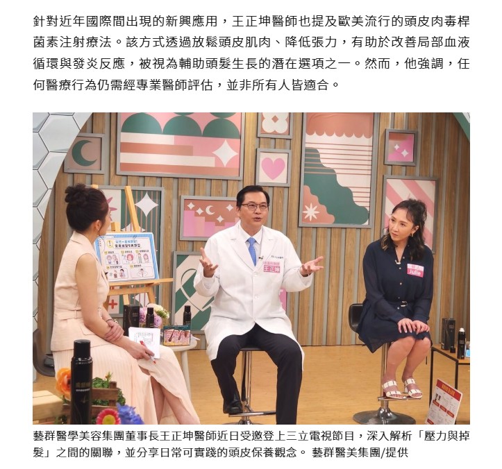 隨著生活節奏加快與壓力指數攀升,掉髮問題正悄然年輕化,從過去多見於中高齡族群,逐漸蔓延至上班族與年輕世代。藝群醫學美容集團董事長王正坤醫師近日受邀登上三立電視節目,與主持人林書煒及藝人Julie、甄莉與徐哲緯同台對談,深入解析「壓力與掉髮」之間的關聯,並分享日常可實踐的頭皮保養觀念,引發觀眾廣泛共鳴。