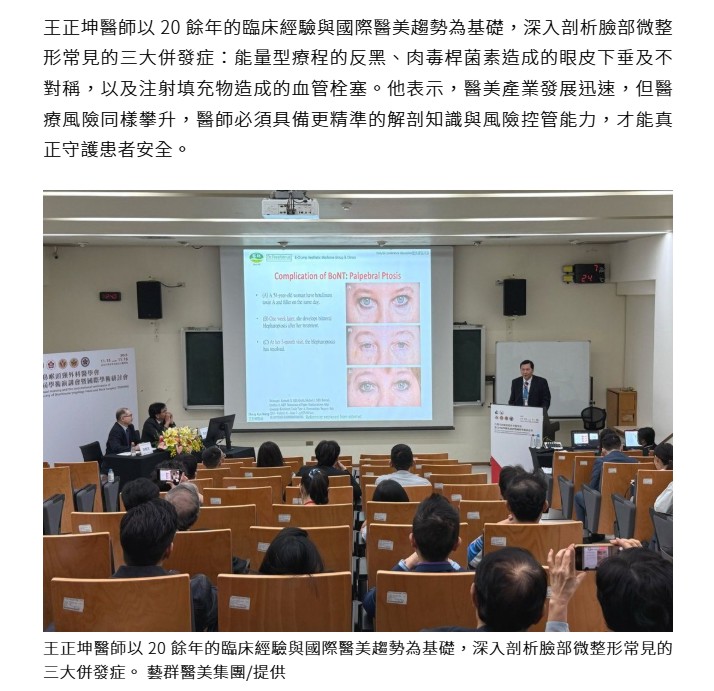 王正坤醫師以 20 餘年的臨床經驗與國際醫美趨勢為基礎,深入剖析臉部微整形常見的三大併發症:能量型療程的反黑、肉毒桿菌素造成的眼皮下垂及不對稱,以及注射填充物造成的血管栓塞。他表示,醫美產業發展迅速,但醫療風險同樣攀升,醫師必須具備更精準的解剖知識與風險控管能力,才能真正守護患者安全。