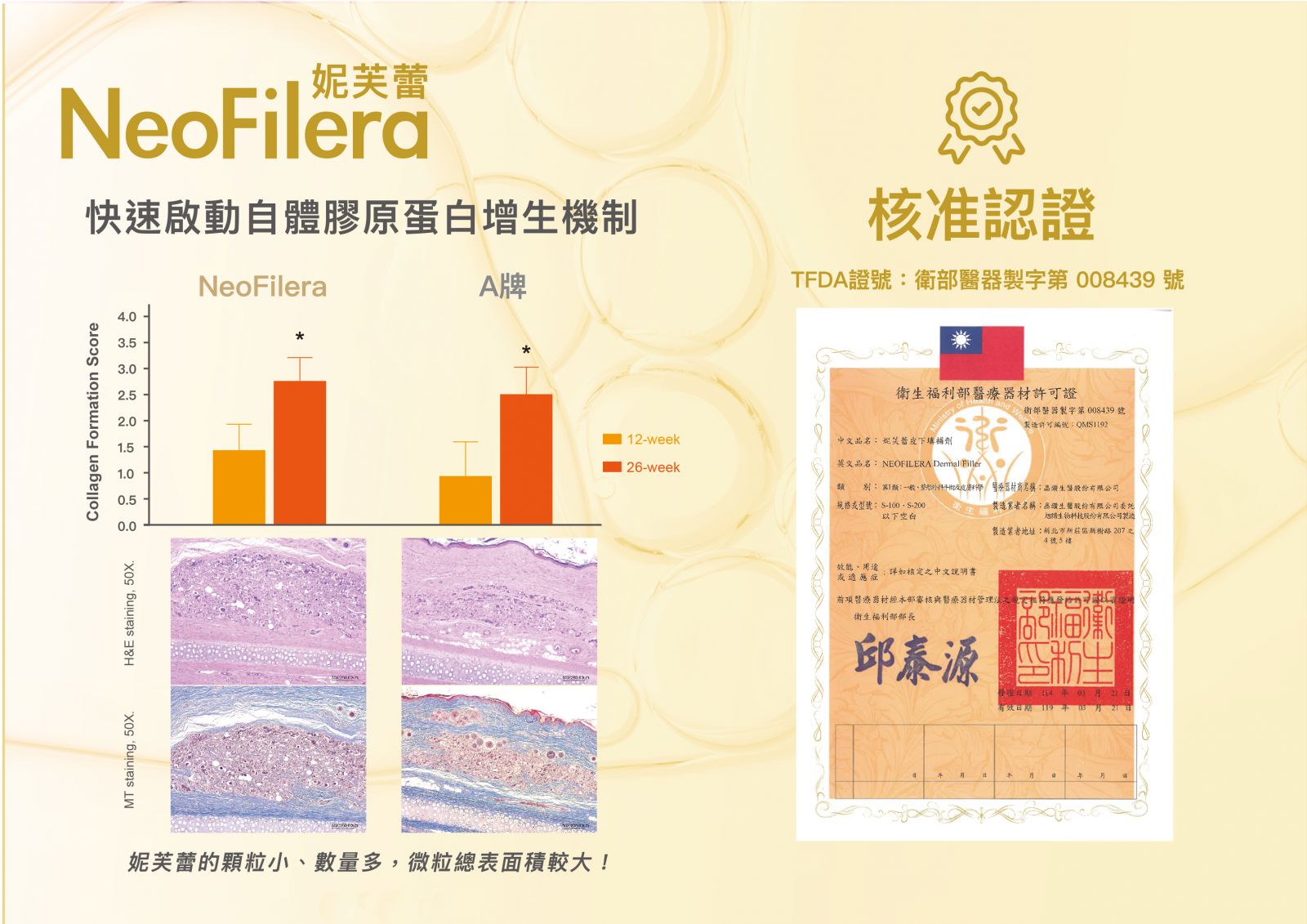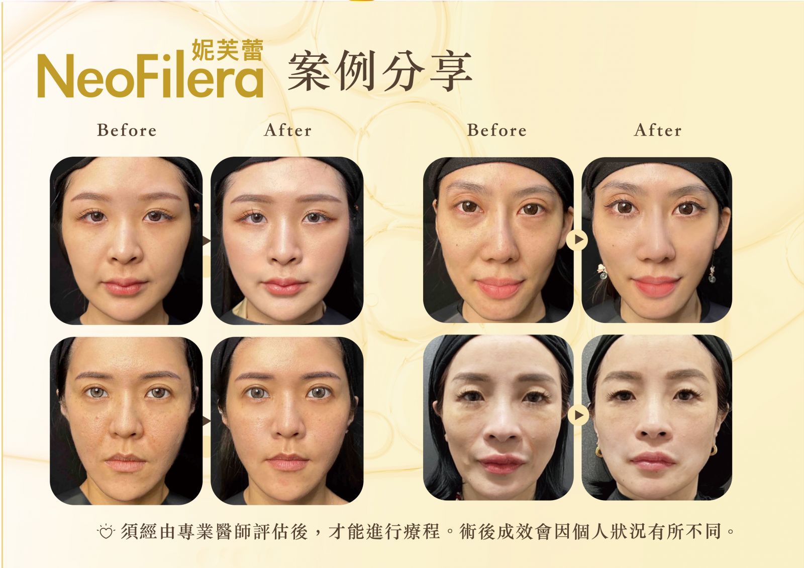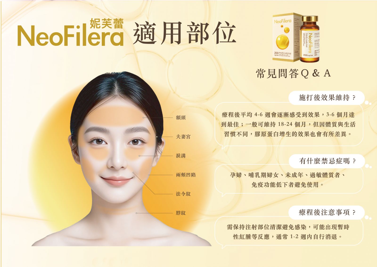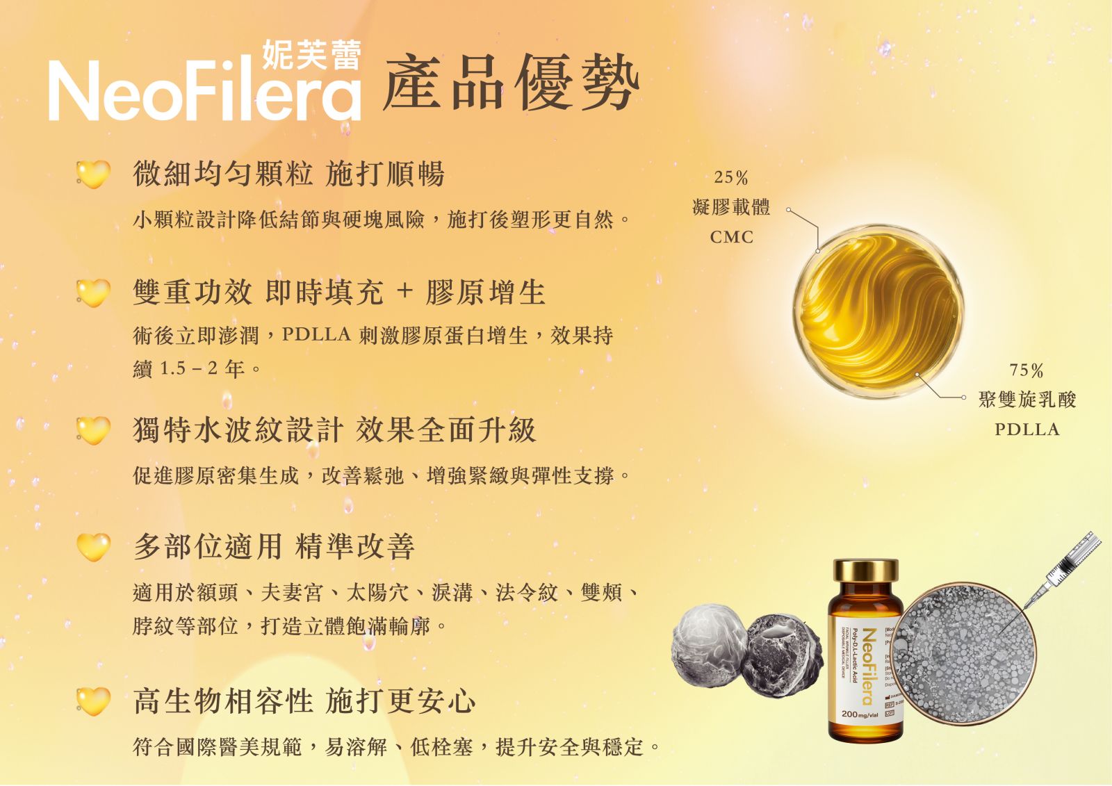 NeoFilera是一款填補肌膚老化凹陷、啟動膠原蛋白增生的皮下填補注射劑。PDLLA是一種可持續刺激膠原蛋白增生的材料,效果可持續長達18至24個月,有助於逐步改善皮膚結構。結合「PDLLA (Poly-D,L-Lactic Acid)聚雙旋乳酸」刺激膠原蛋白增生的特性,及「CMC(Carboxymethyl Cellulose)羧甲基纖維素」的即時填充,有助於減少皺紋和細紋,改善皮膚的質地和彈性,讓肌膚重拾緊緻與彈潤。