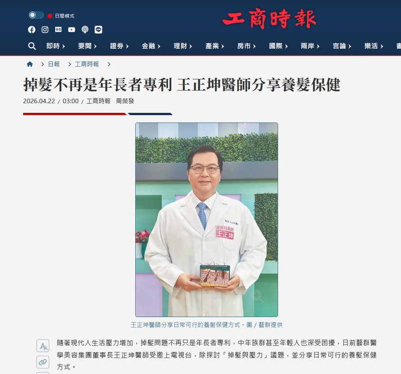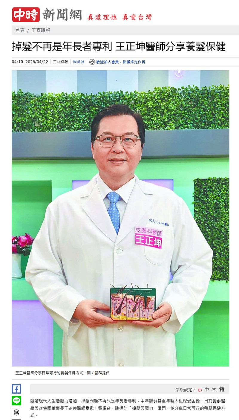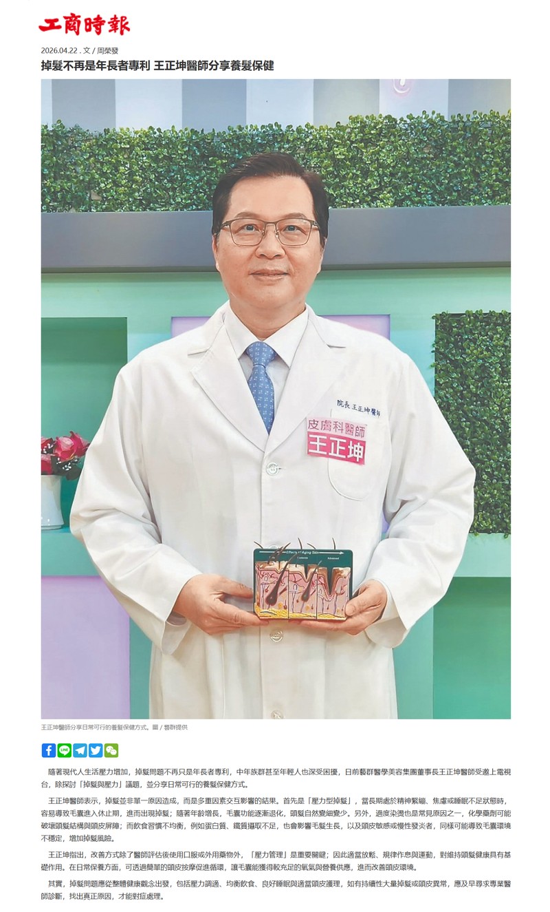 隨著現代人生活壓力增加,掉髮問題不再只是年長者專利,中年族群甚至年輕人也深受困擾,日前藝群醫學美容集團董事長王正坤醫師受邀上電視台,除探討「掉髮與壓力」議題,並分享日常可行的養髮保健方式。