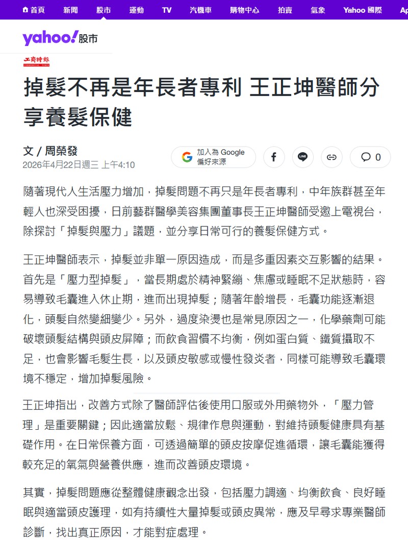 https://tw.stock.yahoo.com/news/掉髮不再是年長者專利-王正坤醫師分享養髮保健-201000975.html -yahoo!奇摩股市