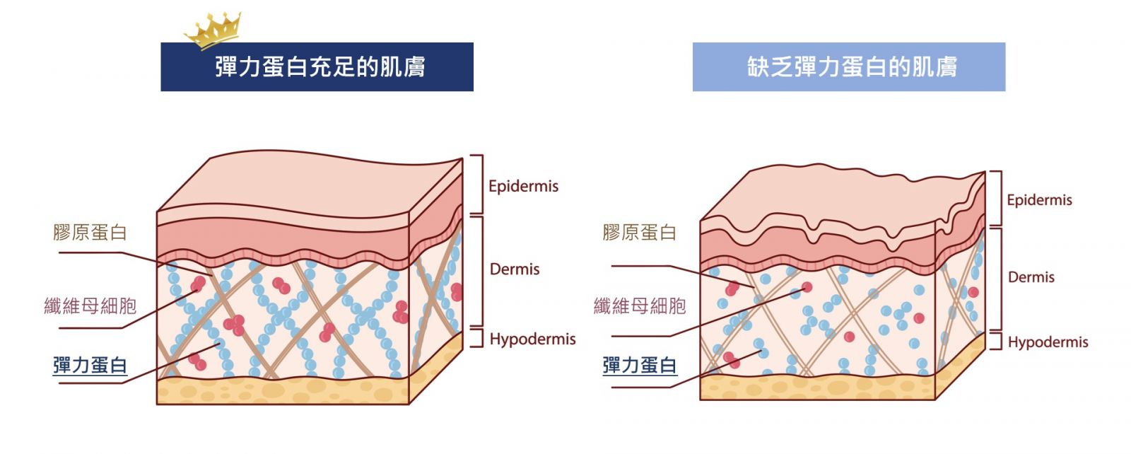 雖然彈力蛋白在肌膚中的含量遠低於膠原蛋白,且在青春期之後便難以再自然合成,但它卻是決定肌膚彈性與線條張力的關鍵角色。一旦彈力蛋白流失,即使膠原蛋白充足,肌膚仍可能出現「鬆弛、下垂、失去支撐」等老化現象。然而,傳統抗老療程多半僅著重於膠原蛋白的補充,或以填充方式修飾體積凹陷,忽略了彈力蛋白對肌膚結構穩定的重要性,因此往往難以真正從根源延緩老化。