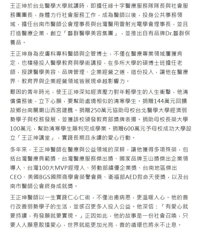 王正坤於台北醫學大學就讀時,即擔任綠十字醫療服務隊隊長與社會服務團團長,身體力行社會服務工作,成為醫師以後,投身公共事務領域,擔任台南市醫師公會理事長與台灣醫用雷射光電學會理事長,並且打造醫療企業,創立「藝群醫學美容集團」,並推出自有品牌Dr.藝群保養品。