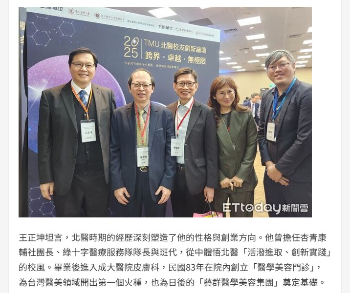 王正坤坦言,北醫時期的經歷深刻塑造了他的性格與創業方向。他曾擔任杏青康輔社團長、綠十字醫療服務隊隊長與班代,從中體悟北醫「活潑進取、創新實踐」的校風。畢業後進入成大醫院皮膚科,民國83年在院內創立「醫學美容門診」,為台灣醫美領域開出第一個火種,也為日後的「藝群醫學美容集團」奠定基礎。